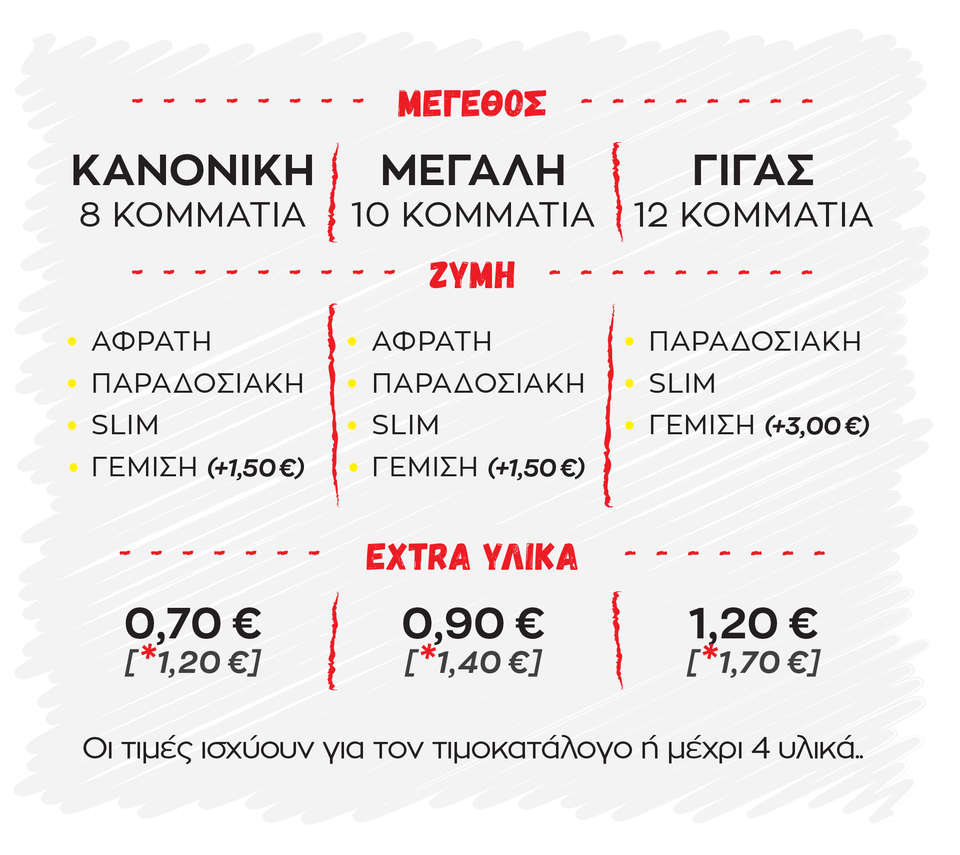 Πεπερόνι, Μπέικον, Ζαμπόν, Χωριάτικο Λουκάνικο, Λουκάνικο Φρανκφούρτης, Σπέσιαλ Πικάντικο Σουτζούκι, Κοτόπουλο, Γύρος Χοιρινός*, Προσούτο*, Καπνιστή Μπριζόλα*